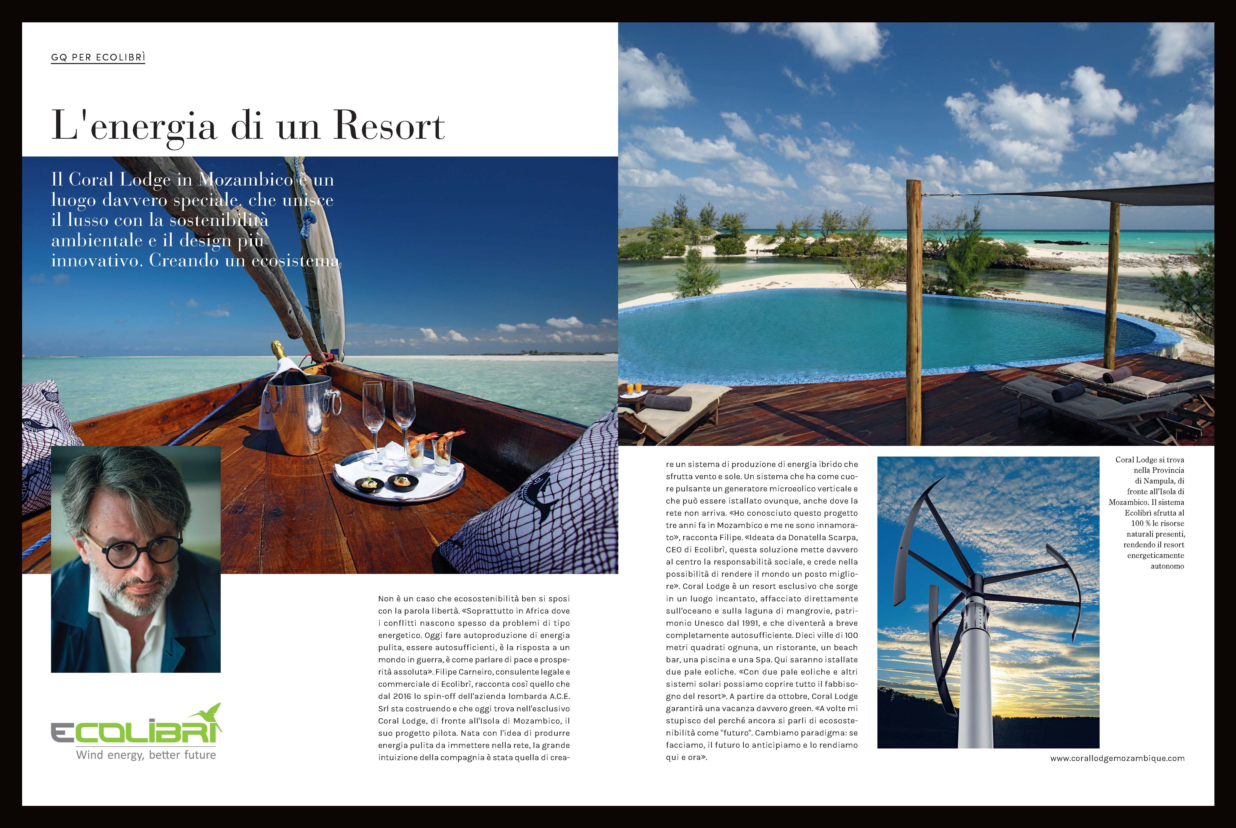 Intervistato da GQ Italia Filipe Carneiro, consulente legale e commerciale di Ecolibrì, racconta della collaborazione con il resort Coral Lodge in Mozambico e del progetto per renderlo energicamente autonomo.